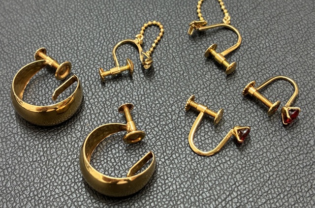 ネジ式タイプのゴールドイヤリングで、赤いストーン付きのデザインもあり、状態も良好なお品でした。