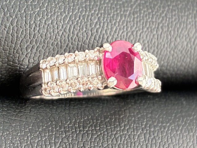 鮮やかな色合いのルビーと、周囲にあしらわれたダイヤモンドが印象的なお品物でした。