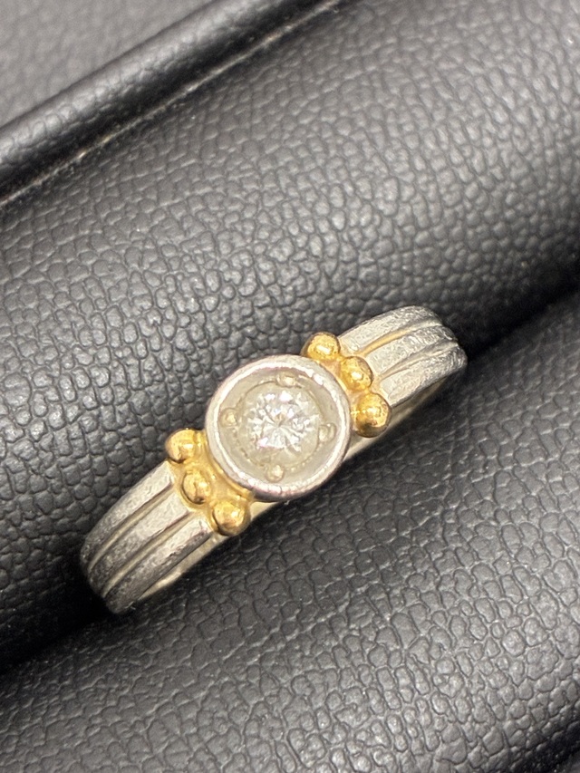 シンプルながらもデザイン性のあるリングで、ダイヤモンドの輝きと金色の装飾が上品なお品でした。